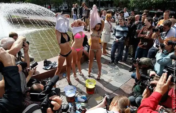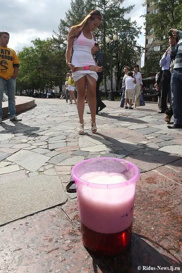 Вчера в Москве, на Пушкинскиой площади активистки интернет-группы «Медведев — наш президент» и неизвестные девушки, называющие себя Medved Girls, провели акцию в поддержку президентского законопроекта о запрете употребления пива в общественных местах. Суть мероприятия заключалась в том, что девушки предлагали случайным молодым людям выливать пенный напиток в специальные ведра, а в награду за своеобразное пожертвование поклонницы президента снимали с себя одежду. За 3 литра пива, оказавшегося в ведре, девушки готовы были лишиться шорт, а за 6 литров — майки.