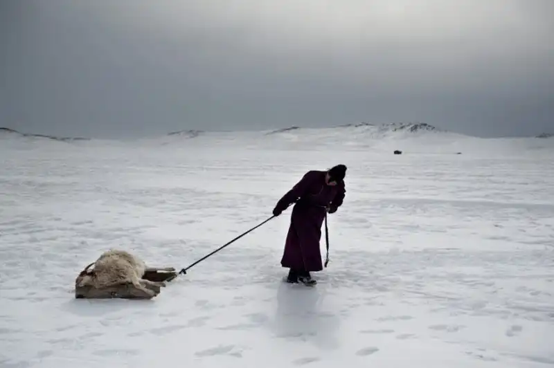 1. Местная жительница Эрдене Туя тянет за собой тушу замерзшей овцы.