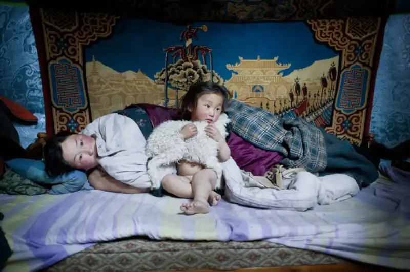 5. Утро в холодной юрте. Эрдене, ее 3-х летний малыш Тувчинж и маленький ягненок просыпаются после морозной ночи. Старшие члены семьи, муж Бартгаргал и сын Азжаргал, вышли проверить стадо.