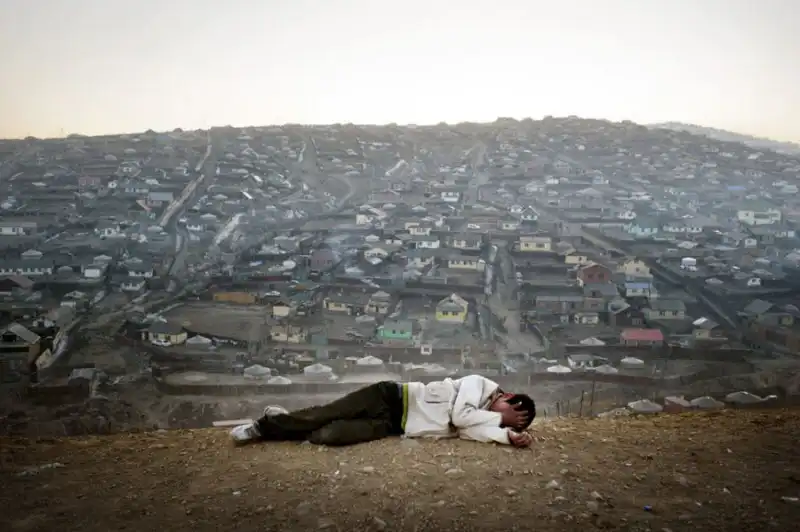 6. Панорама столицы Улан-Батор. На переднем плане – спящий монгол. Алкоголизм является острой проблемой для жителей столицы. За последние несколько лет ее население увеличилось в 2 раза. Условия жизни в Улан-Баторе ужасные, многие горожане переселяются в трущобы, так называемые «Округи Юрт». В городе высокий уровень нищеты и безработицы, жители лишены регулярного доступа к электричеству и водоснабжению.