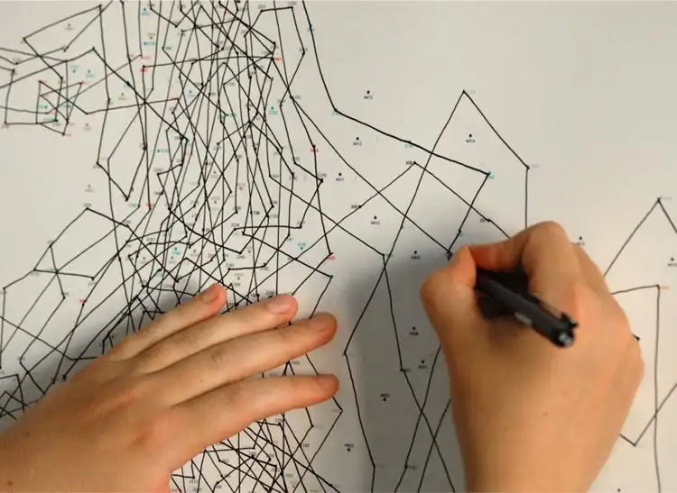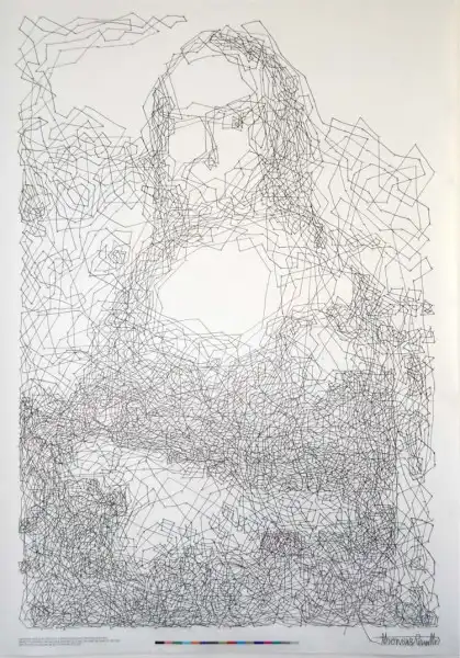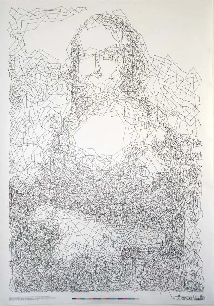 Многие помнят эти простые, но увлекательные детские ребусы из газет и журналов, где нужно соединить точки сплошной линией, и получится картинка. Видимо, молодой художник Томас Павитт (Thomas Pavitte) из Мельбурна до сих пор любит разгадывать эти ребусы, иначе он бы не рискнул потратить 10 часов времени, чтобы сперва создать, а затем "нарисовать" портрет Моны Лизы, соединив одной сплошной линией ровно 6239 разноцветных точек.