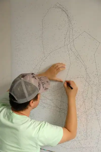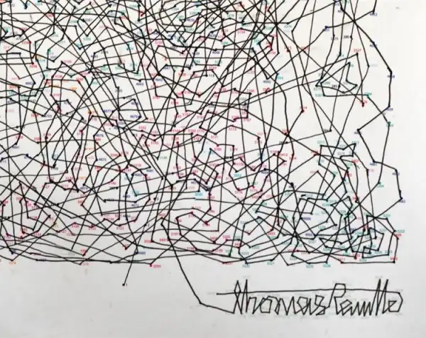 Чтобы не ошибиться в цифрах, и не забыть, какую точку ему нужно найти в данный конкретный момент, художник окрашивал каждые 400 точек разными цветами. Не забыл он и об авторском копирайте, - свою собственную подпись он разместил в правом нижнем углу, также в виде точек. Ее тоже следует обвести.