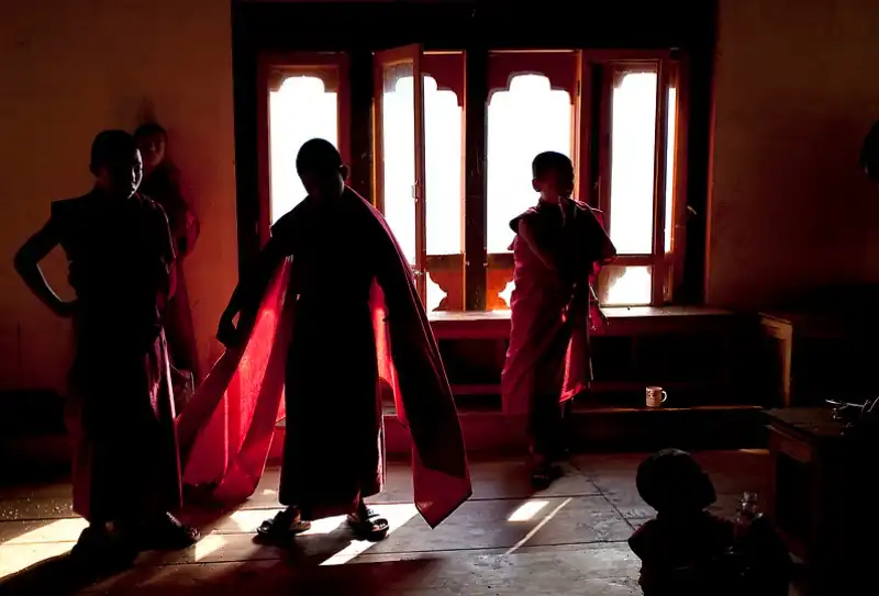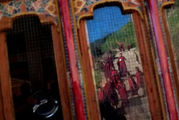 Буддийские монахи-послушники в Бутане отражаются в окне, прибывая к завтраку в монастыре в Тхимпху, Бутан. Бутан - единственное государство в мире, где официально запрещено курение, а правительство озабочено не столько повышением ВВП, сколько ростом ВНС - Валового национального счастья. Это весьма странное для мировых финансов понятие было введен в оборот четвертым королем страны и означает развитие такой экономики, которая соответствовала бы буддийским ценностям.