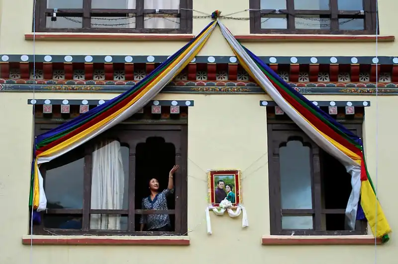 Бутанская женщина выглядывает из своего дома рядом с портретом короля Джигме Кхесара Намгьяла Вангчука и будущей королевы Бутана Аши Джецун Пемы Вангчук, 12 октября 2011 года в Тхимпху. В стране проходили последние приготовления к королевской свадьбе.