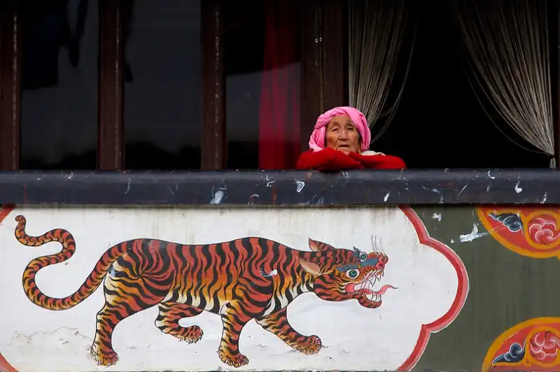 Бутанская старушка смотрит на улицу, наблюдая за приготовлениями к королевской свадьбе в Тхимпху, Бутан, 12 октября 2011 года. Бутан, расположенный в Гималаях, между Индией и Китаем, по праву считается одним из самых закрытых, но в то же самое время и одним из самых демократических стран в мире.