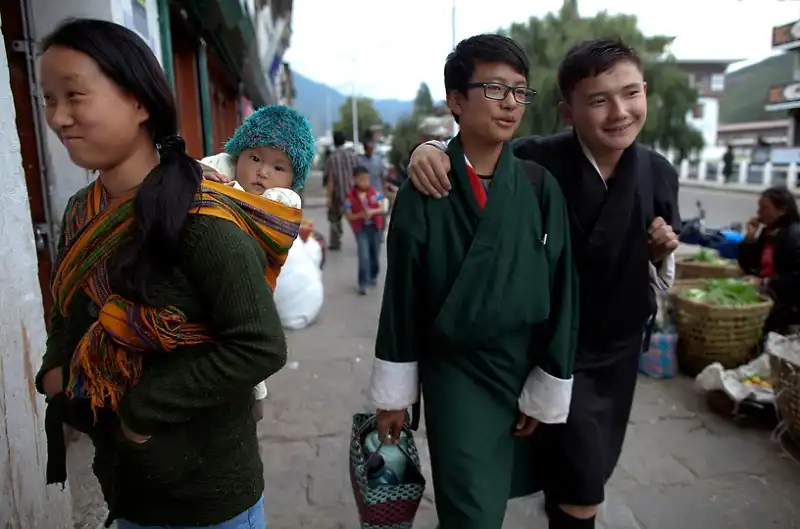 Бутанская молодая мама улыбается, видя, как местные жители готовятся к королевской свадьбе будущих короля и королевы Бутана Джигме Кхесара Намгьяла Вангчука и Аши Джецун Пемы Вангчук, 12 октября 2011 года. Свадьба 31-летнего властителя стала предметом горестных страданий многих его поклонниц. Клубы поклонниц молодого монарха существует на всей территории от Индии до Индонезии.