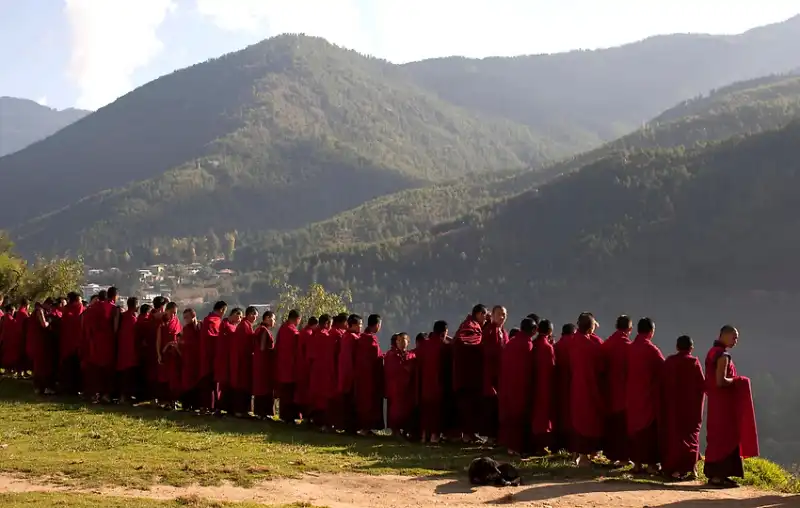 Буддийские монахи-послушники в Бутане стоят вне монастыря в Тхимпху, столице страны, в среду, 12 октября 2011 года. По мнению бутанских политиков, свадьба короля Вангчука является серьезнейшим вложением в Валовое счастье, процент которого только возрастает с каждым днем чествования новой королевы.