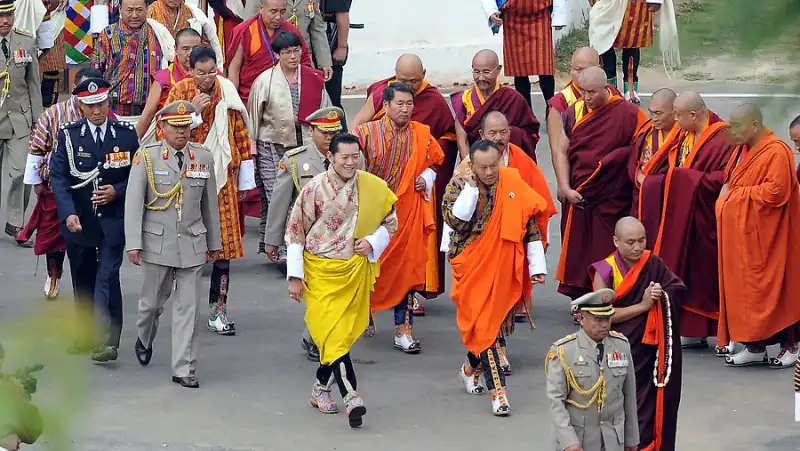 Король Бутана Джигме Кхесар Намгьял Вангчук (в центре) с премьер-министром Бутана Джигме Тинли (в центре справа, в оранжевом) прибывает на королевскую церемонию бракосочетания с Джецун Пема (не видна).