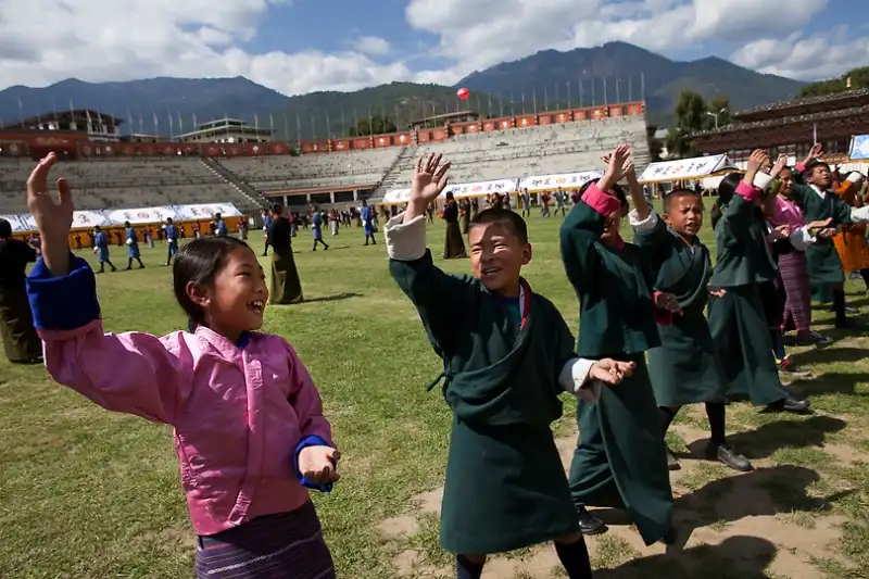 Бутанские ученики разучивают танец на стадионе для предстоящих торжеств по случаю королевской свадьбы 12 октября 2011 года в Тхимпху, Бутан.