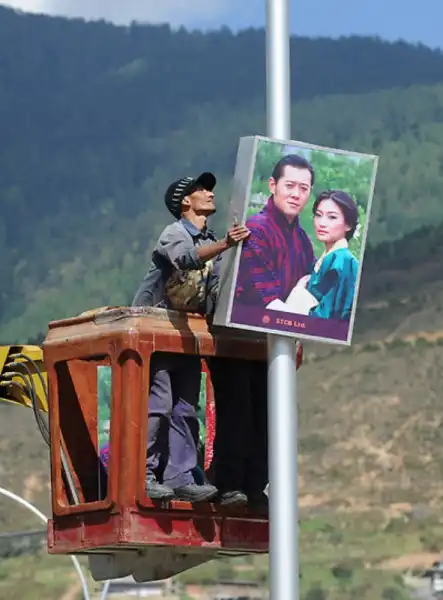 Бутанский рабочий подводит свет к портрету короля Джигме Кхесара Намгьяла Вангчука и будущей королевы Бутана Аши Джецун Пемы Вангчук в процессе приготовления к королевской свадьбе в Тхимпху, Бутан, среда, 12 октября 2011 года.