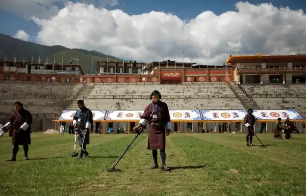 Офицеры службы безопасности Бутана используют металлодетекторы для проверки территории главного стадиона, где пройдут празднества по случаю королевской свадьбы в Бутане в столице страны, Тхимпху.