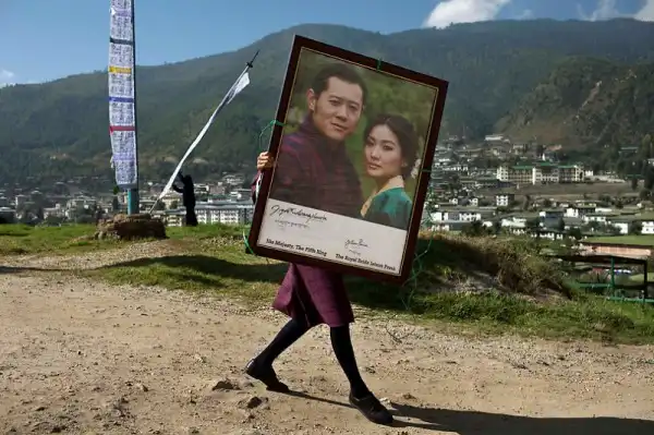Бутанский студент несет портрет короля Джигме Кхесара Намгьяла Вангчука и будущей королевы Джецун Пемы, прежде, чем повесить его за пределами школы Lungten Zanpa School, их альма-матер в Тхимпху, столице Бутана.
