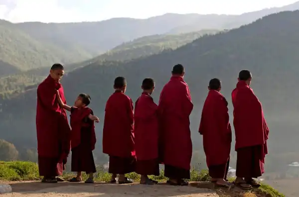Буддийские монахи-послушники в Бутане стоят вне монастыря в Тхимпху, столице страны, в среду, 12 октября 2011 года.