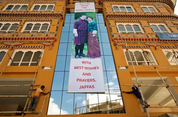 Рабочие размещают гигантское знамя с изображением короля Джигме Кхесара Намгьяла Вангчука и будущей королевы Джецун Пемы на здание в Тхимпху, столице Бутана, в среду, 12 октября 2011 года.