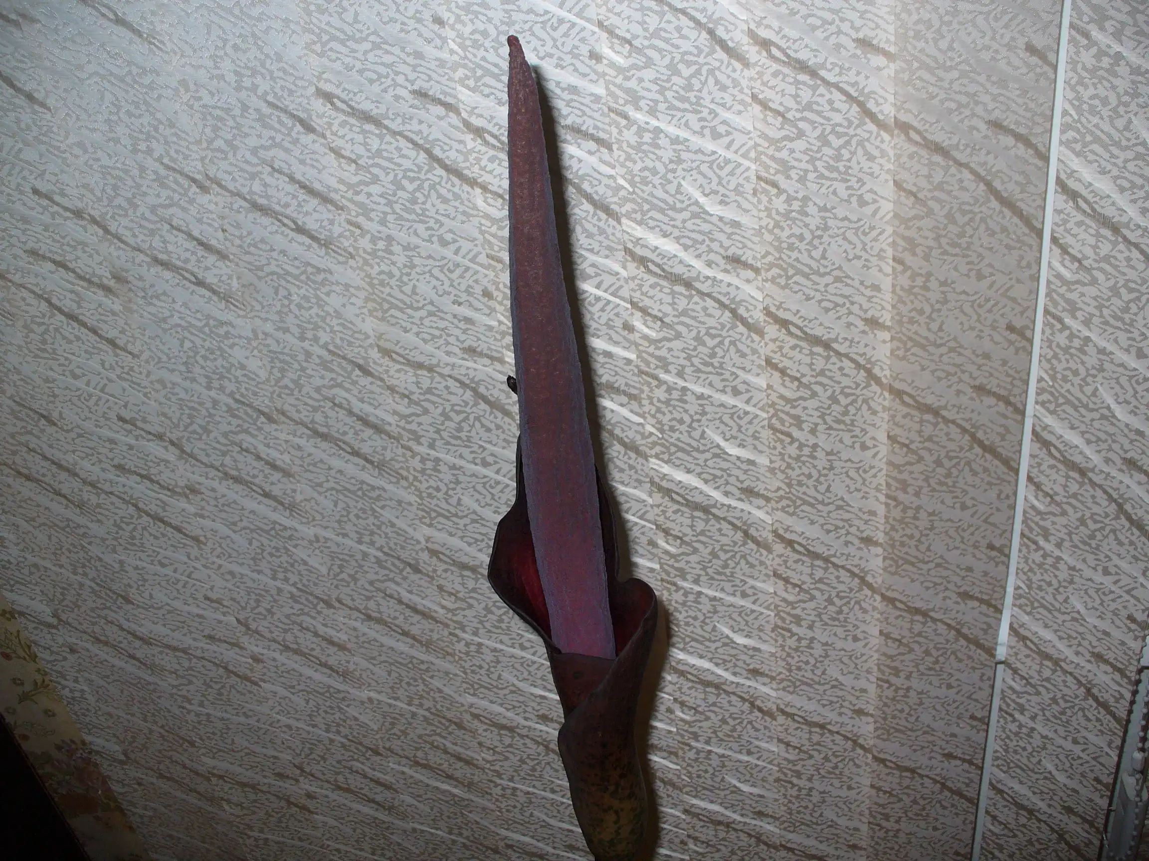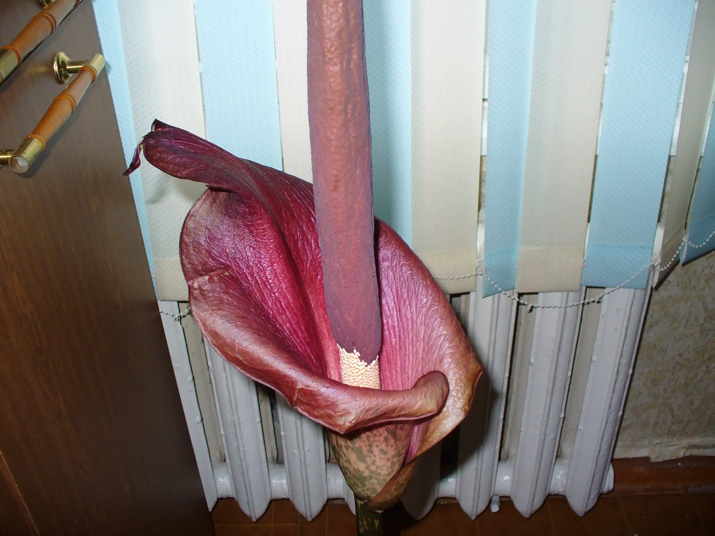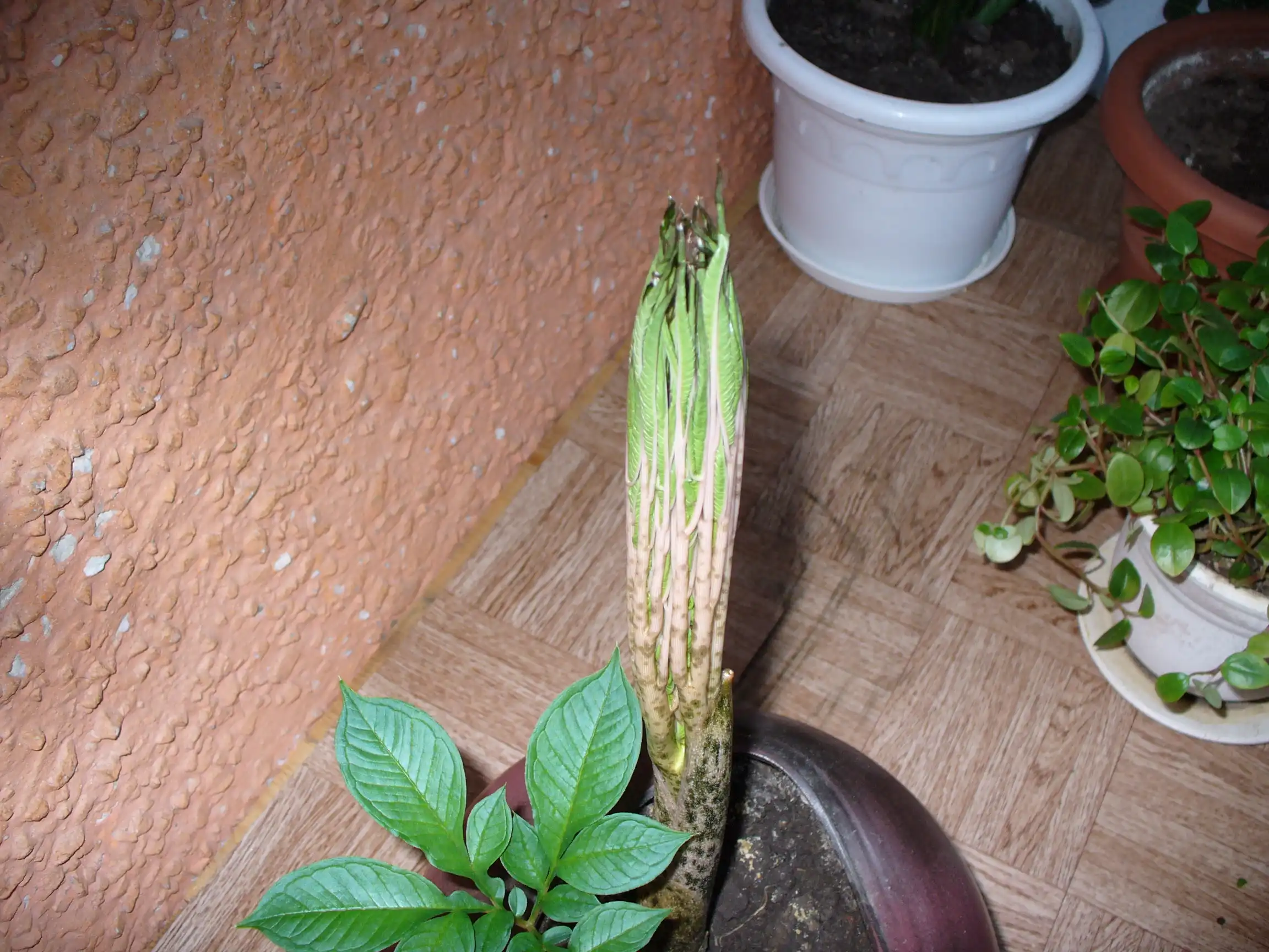 Потом "пальма" отмирает, её стебель выдергивают и оставшийся клубень зимует без полива. Очень редко (у меня впервые) растение зацветает. "Пальма" отпала, горшок стоял пустой и вдруг полез стебель! Потом он зацвел...и завонял тухлым мясом!