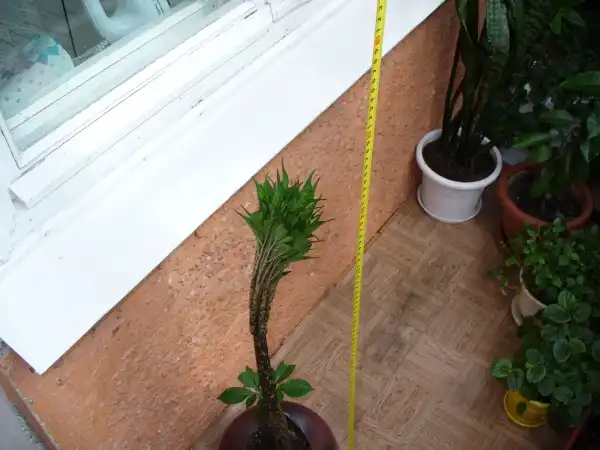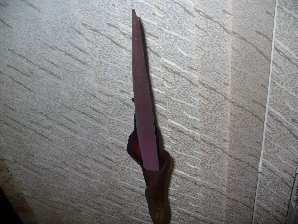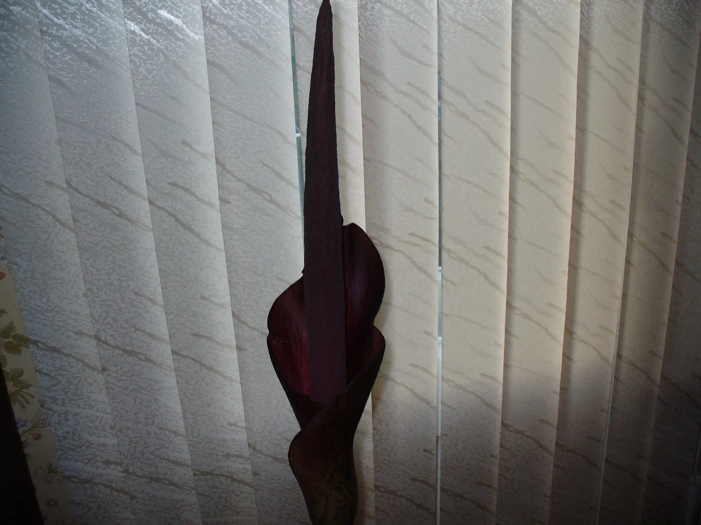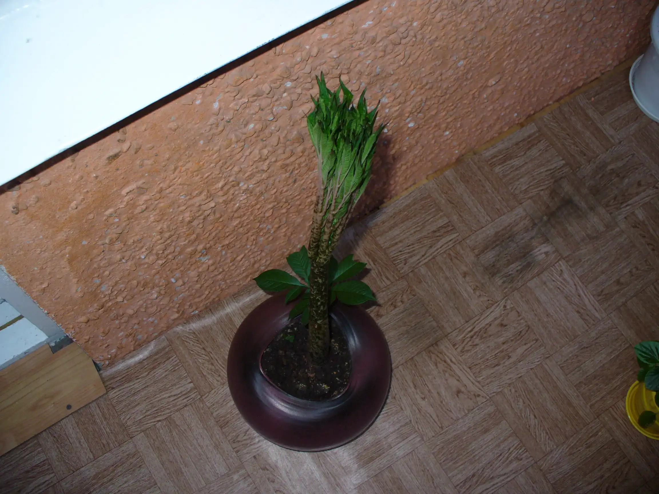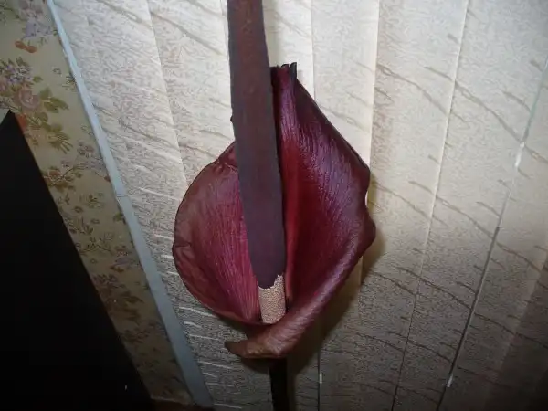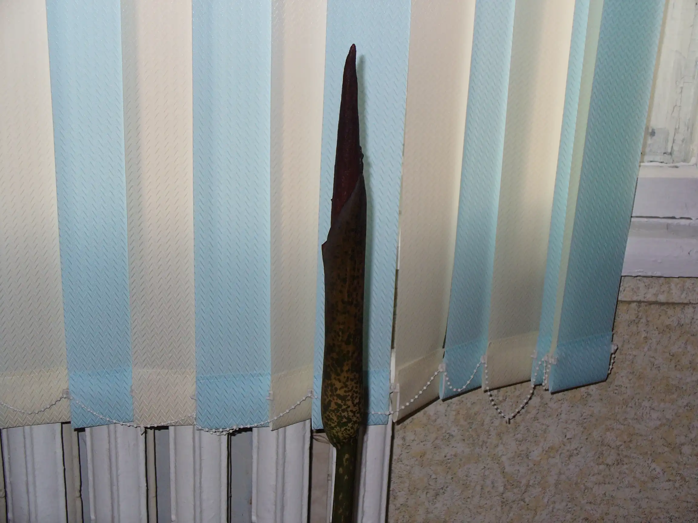 Потом "пальма" отмирает, её стебель выдергивают и оставшийся клубень зимует без полива. Очень редко (у меня впервые) растение зацветает. "Пальма" отпала, горшок стоял пустой и вдруг полез стебель! Потом он зацвел...и завонял тухлым мясом!