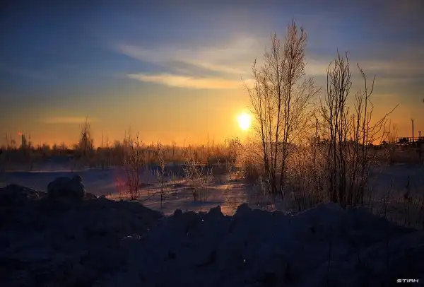 Время позднее, пора поворачивать в обратную сторону. Температура быстро опускается. Сейчас в кадре где-то в районе -30С -35С. За пределами городской черты холоднее примерно градусов на 5-10. С наступлением темноты в этой местности, температура может резко подскочить и до -50С. -30С переносится легче чем в Питере, но не на много. Здесь так же, большая влажность.