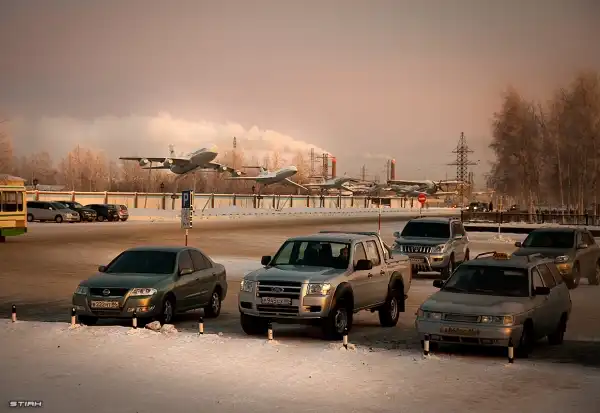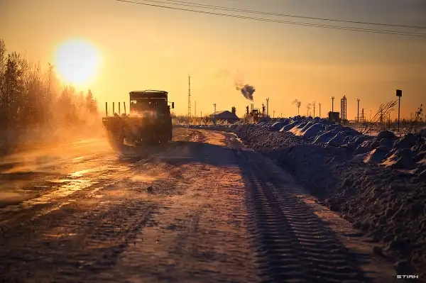 Местами проносятся грузовые машины, увлекая за собой шлейф из морозной ледяной крошки. Иногда двигаются караваны широких груженных сырьём, машин. Ширину покрышек которых, расстояние между колесами и глубину протектора можно видеть на отпечатках на дороге.