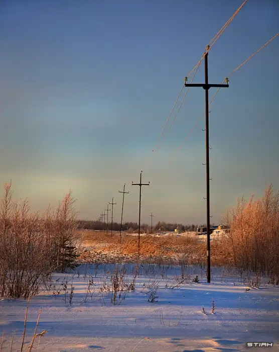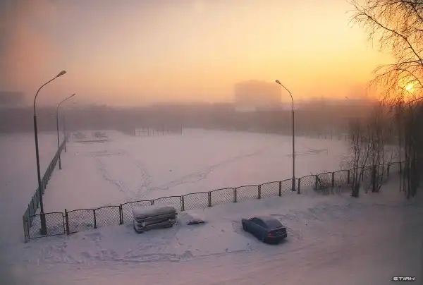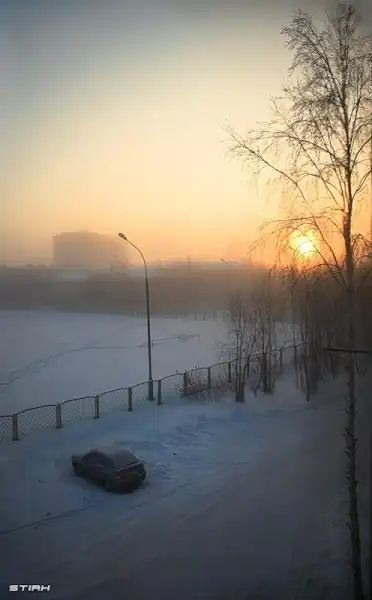 К вопросу о том, какие бывают морозы. В кадре утро. Температура -45С- 47С. Из-за высокой влажности стоит туман. Здесь, в кадре, он уже отступает. До восхода туман скрывал все, вплоть до середины поля, оставляя только слабые пятна зданий на заднем плане.