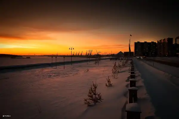 Если днём Нижневартовск может показаться достаточно тусклым, то вечером это с лихвой компенсирует закатными красками! Перед Вами, недавно выстроенная набережная.