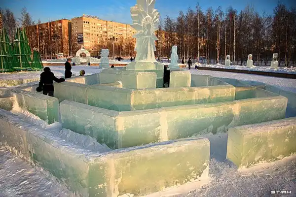 В центре площади стоит ледяной лабиринт, очень популярный среди детской аудитории