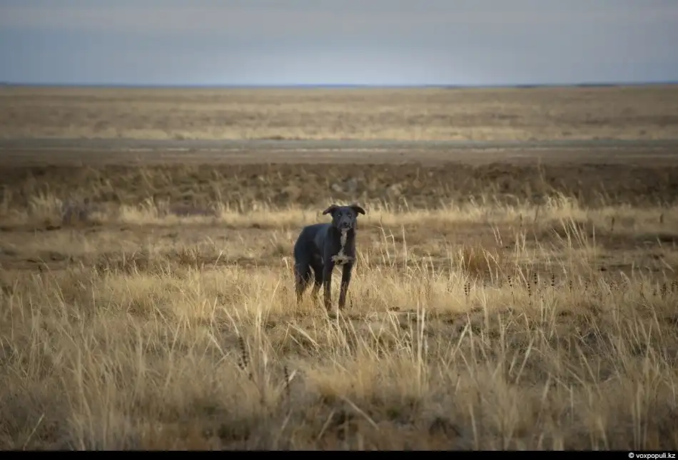 Хозяин боевой скважины – дикий пес. Сидел и с большим любопытством наблюдал за съемкой. Но когда я попытался подойти к нему поближе, стал рычать, а затем отбежал на несколько метров