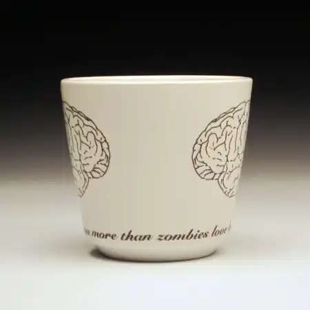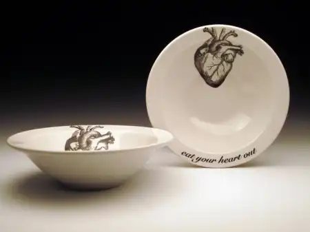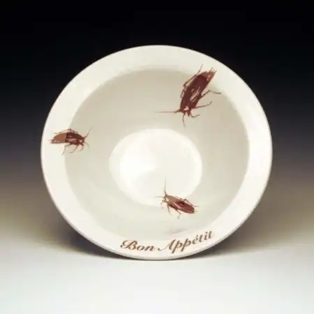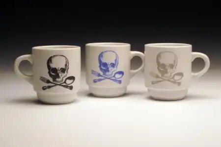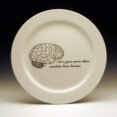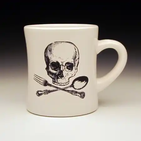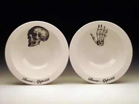 27-летняя дизайнер Мередит Хост (Meredith Host) aka Foldedpigs из Детроита, создает дизайн посуды для гурманов. Являясь ярой поклонницей фильмов ужасов, она делает противоречивые рисунки на тарелках и чашках. Человеческие черепа и кости, мозги и сердце и... немного тараканов - создадут неповторимое ощущение за обедом.