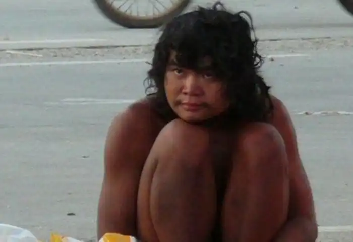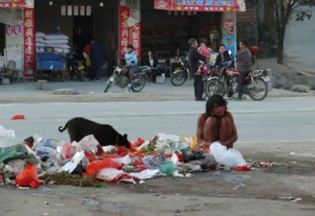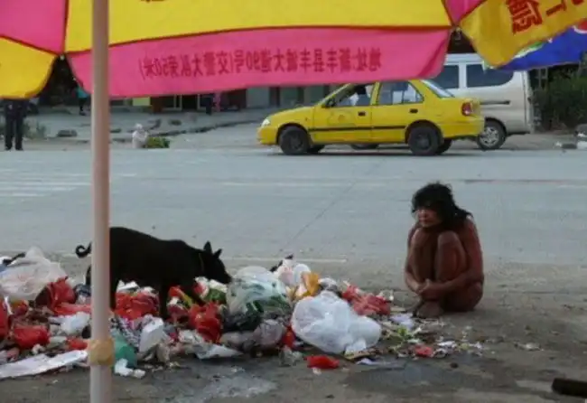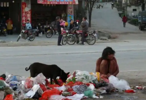 Сидит бедняга в мусорке, голодный, голый, грязный.