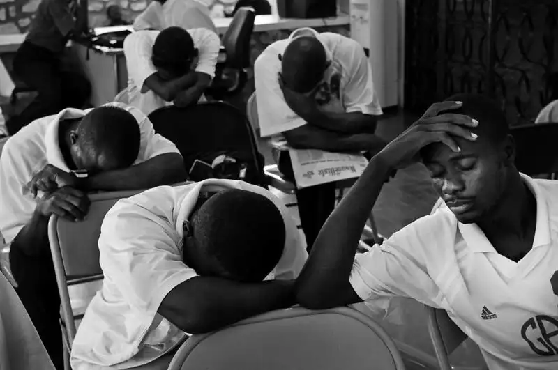 31-летний Денис Гюстав (справа) спит рядом со своими товарищами по команде в ожидании новостей о паспортах для поездки в Аргентину на Чемпионат мира по футболу среди людей с ампутированными конечностями. После трехчасового ожидания члены гаитянской сборной смогли получить паспорта. (Photo by Leah Millis)