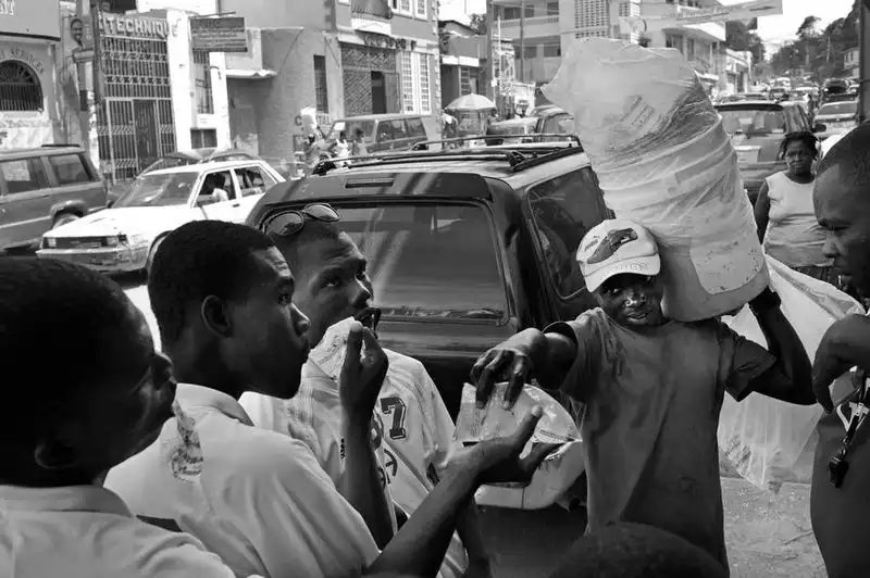 Слева направо: 24-летний Эммануэль Ладокью, 23-летний Франсуа Макенди и 25-летний Жак Франц Цезарь покупают воду у уличного торговца в ожидании новостей о своих паспортах у здания посольства Гаити. (Photo by Leah Millis)