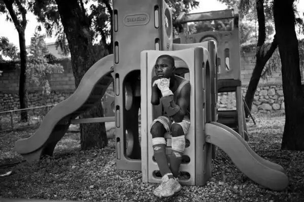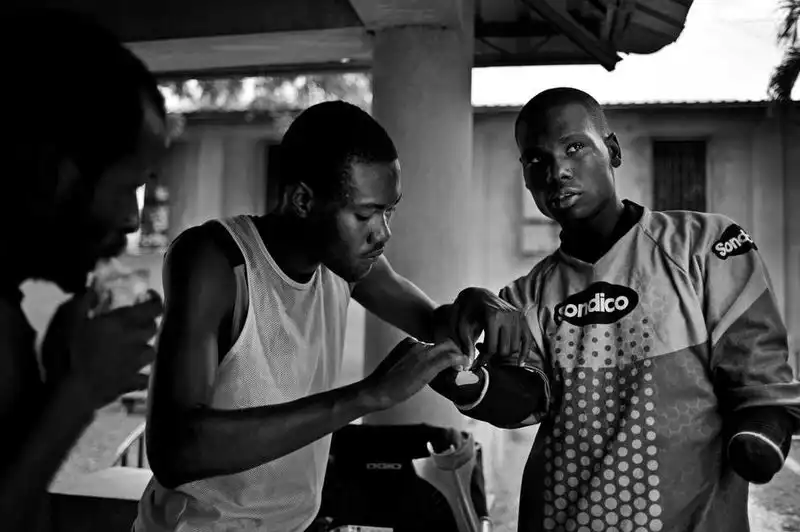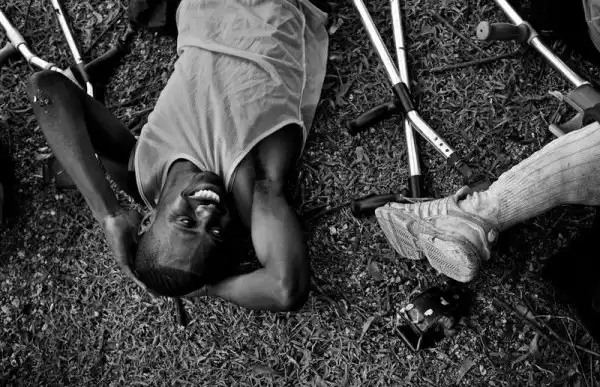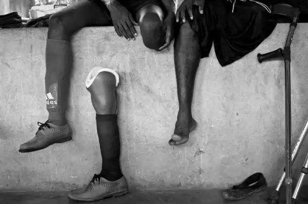 25-летний Жак Франц Цезарь из футбольной сборной людей с ампутированными конечностями вместе со своим товарищем Андре Пакомбе во время ожидания новостей о документах команды, необходимых для поездки в Аргентину на Чемпионат мира по футболу среди людей с ампутированными конечностями. (Photo by Leah Millis)