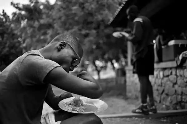 25-летний Жак Франц Цезарь ест лапшу, держа вилку на сгибе локтя после тренировки. (Photo by Leah Millis)
