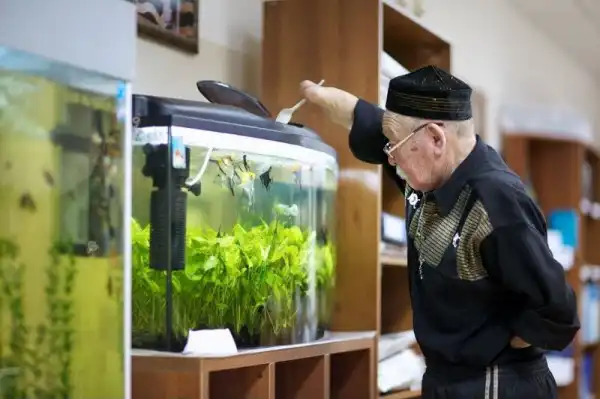 Расположенные в библиотеке аквариумы являются собственностью Нурлыбека. Это не просто декоративный уголок в помещении, скорее увлекательное хобби. 16 лет назад друг Нурлыбека уехал в Германию и оставил ему 3 больших аквариума. Так у Нурлыбека зародилась любовь к аквариумным рыбкам.