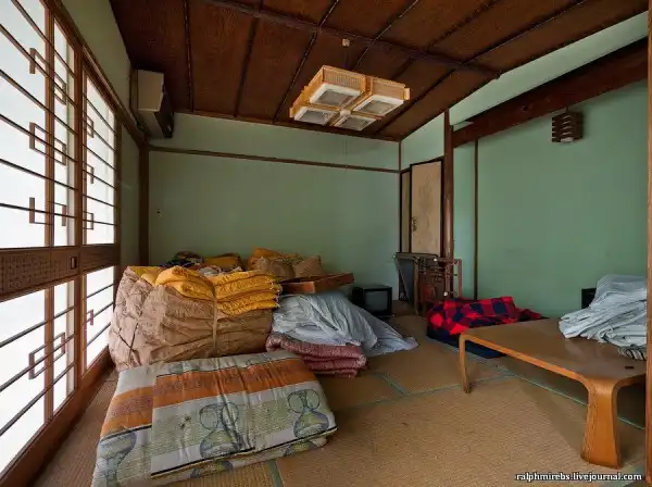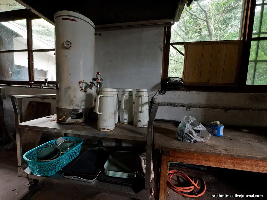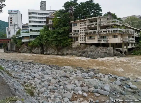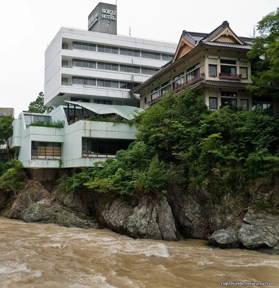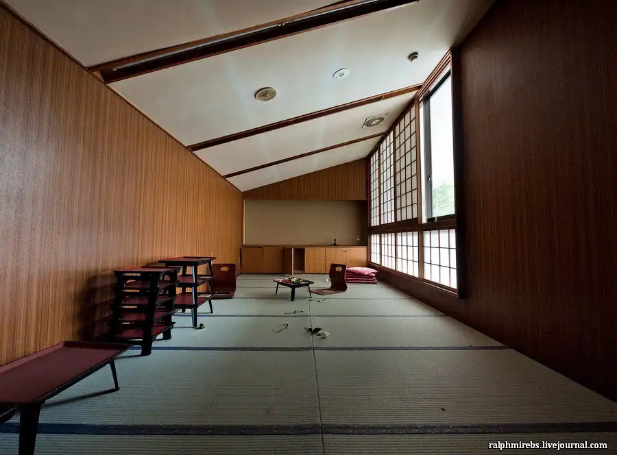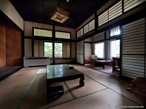 Огромные обеденные залы, устланные татами - замечательное место ночлега одинокого туриста. Именно в этих отелях я обнаружил нераспечатанный ящик минеральной воды, три ящика спичек, ящик мыла и множество других полезных в походе вещей. Отель, а точнее комплекс из четырёх зданий различной архитектуры, расположен на берегу небольшой горной речушки и его географическое позволяет служить воротами на западное побережье Японии. Самое крайнее из зданий буквально нависает над водою, являясь фотокарточкой тамошних мест. Весь комплекс давно заброшен.