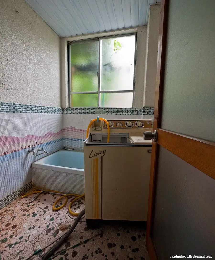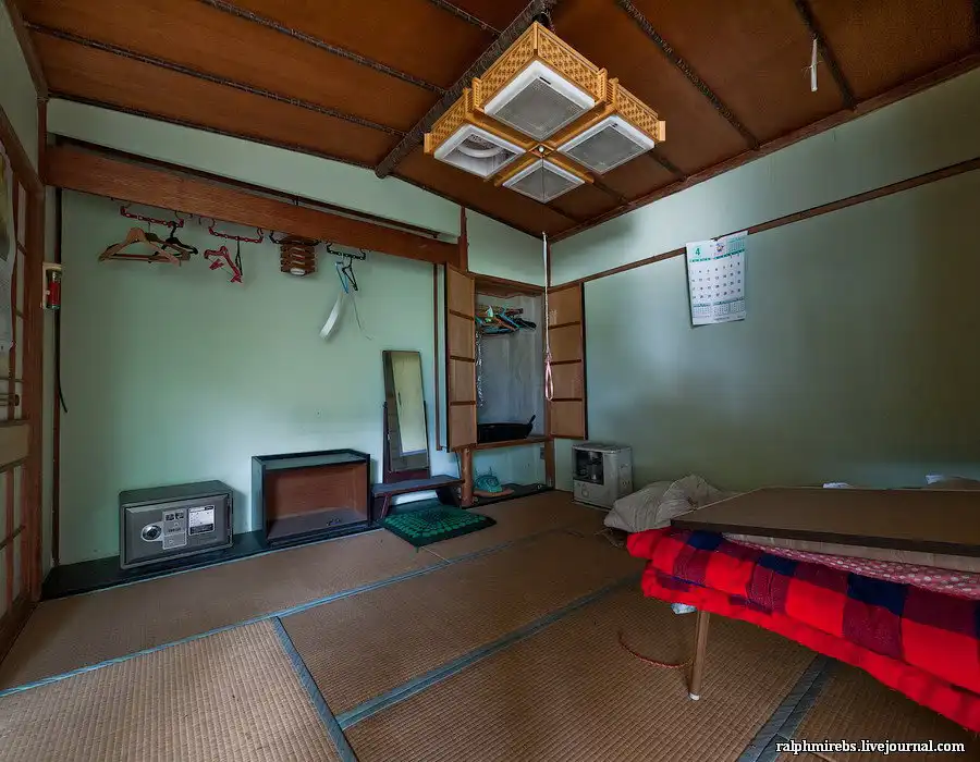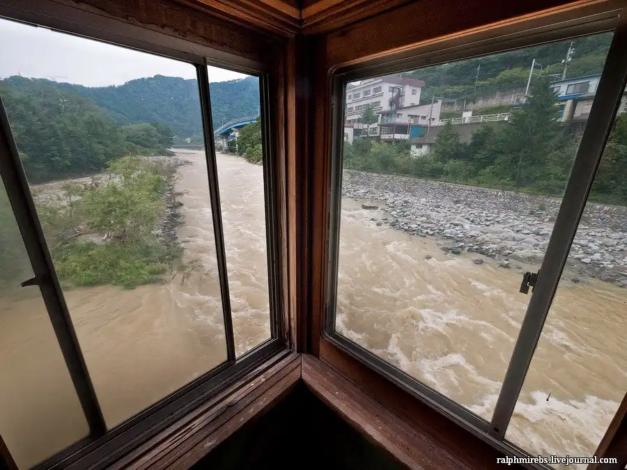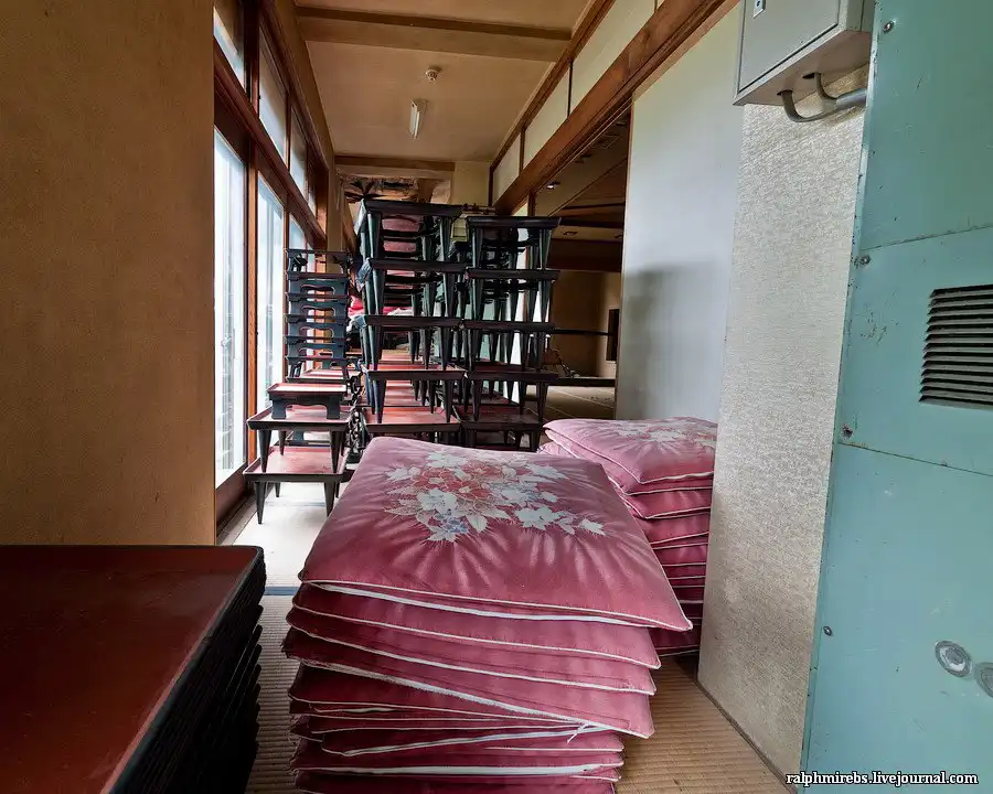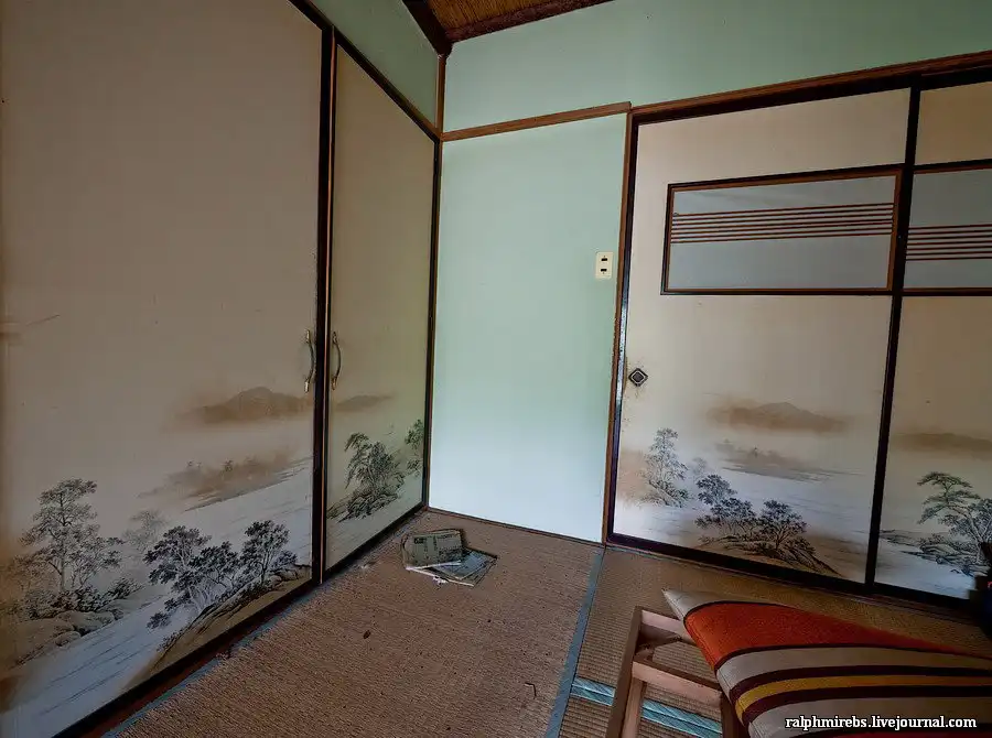 Огромные обеденные залы, устланные татами - замечательное место ночлега одинокого туриста. Именно в этих отелях я обнаружил нераспечатанный ящик минеральной воды, три ящика спичек, ящик мыла и множество других полезных в походе вещей. Отель, а точнее комплекс из четырёх зданий различной архитектуры, расположен на берегу небольшой горной речушки и его географическое позволяет служить воротами на западное побережье Японии. Самое крайнее из зданий буквально нависает над водою, являясь фотокарточкой тамошних мест. Весь комплекс давно заброшен.