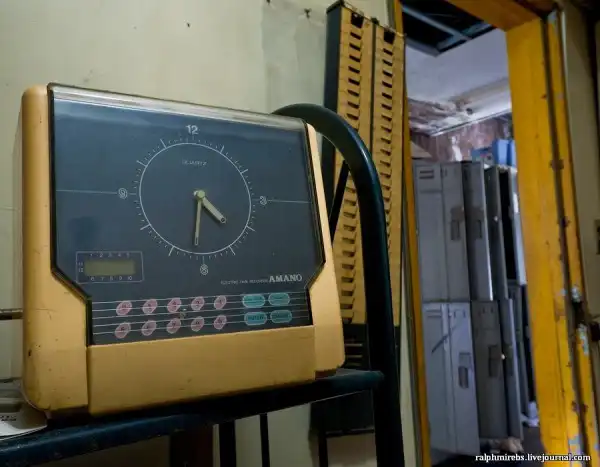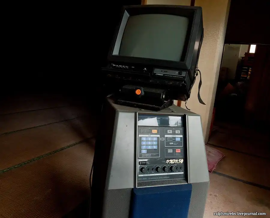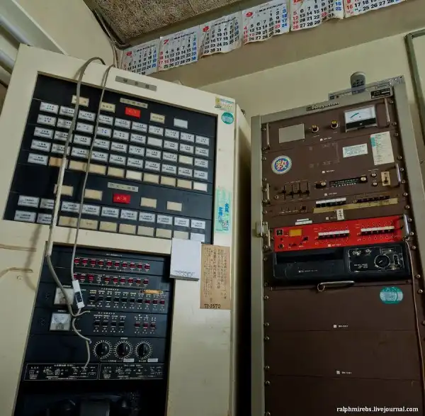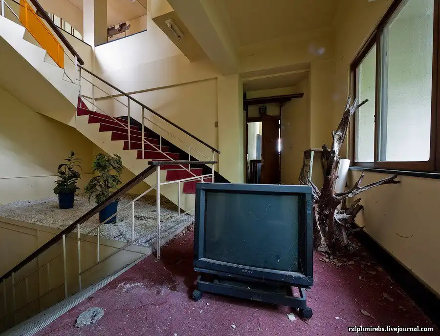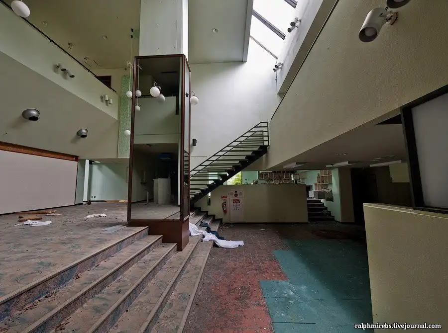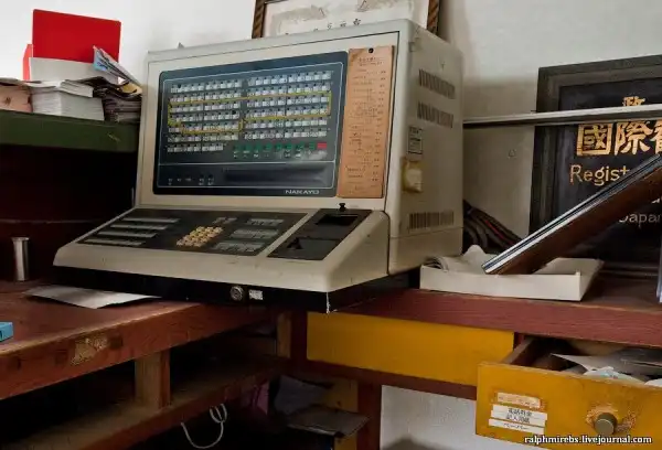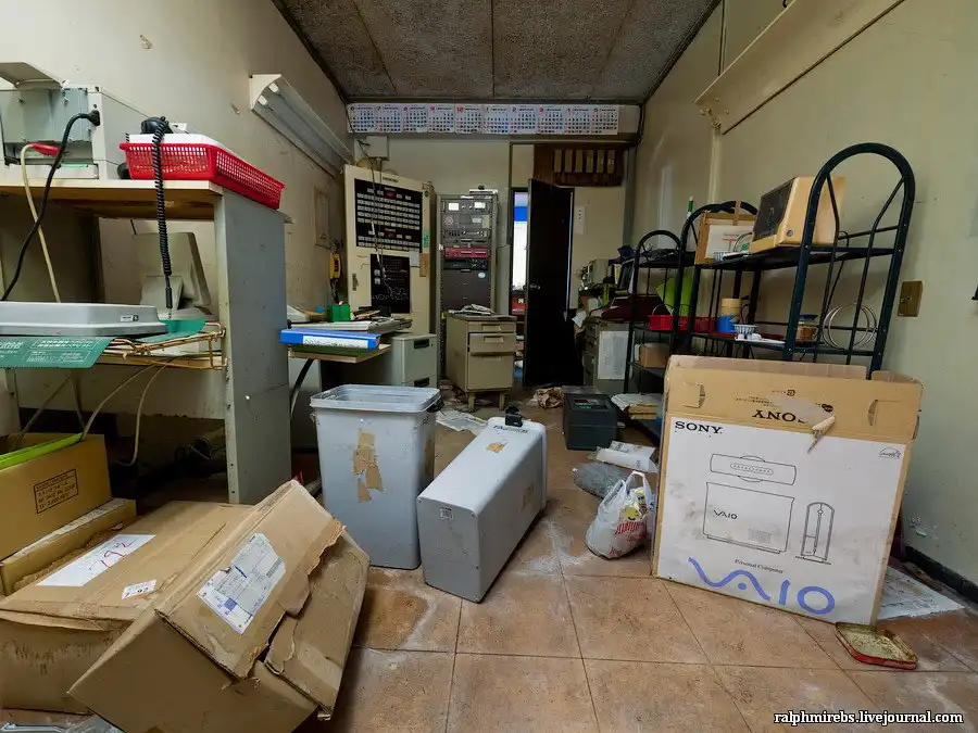 Электронная пишущая машинка, принимаемая всеми за ноутбук. Такую машинку я встречаю на объектах уже четвёртый раз.А ещё в этом отеле я как-то напугал японцев. Дело в том, что идя однажды по коридору, я заметил красное свечение бьющее из-за угла. Это была лампочка подсветки автофокуса в фотоаппарате, после чего последовала и яркая фотовспышка. Притаившись я услышал тихие голоса - это была парочка местных любителей заброшки - после чего громким и грубоватым голосом спросил по-японски "Кто тут!?". Парочка, услышав слова и не видя меня из-за угла, резко сорвалась с места и побежала со всех ног прочь в сторону лестницы. Видимо, с перепугу, они приняли меня за охранника.