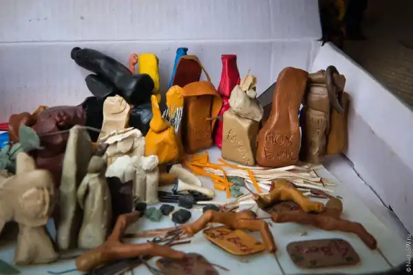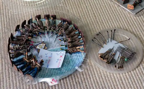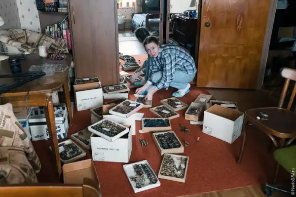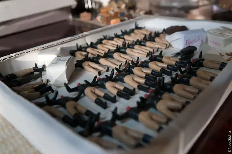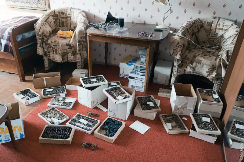 Для деталей формы он использовал массу подручных материалов — верёвочки, фольгу, проволоку, волос. То, что нельзя было изначально сделать правильного цвета — красил. Раньше — палочкой с краской на конце, в новое время — гелевой ручкой, коих у него великое множество каких–то невероятных цветов.