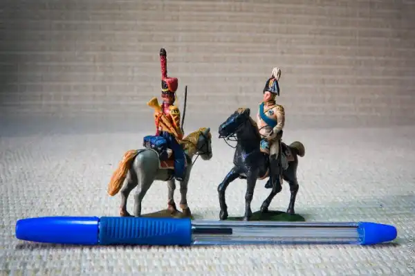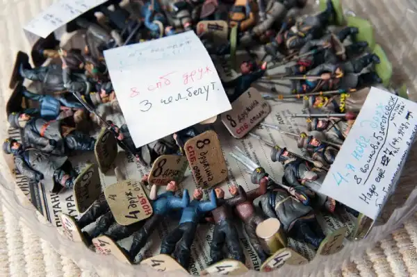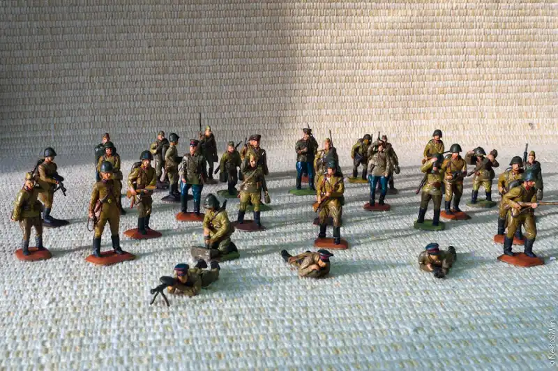 Что самое интересное, он использовал обычный пластилин из канцелярского магазина. с весёлыми львятами на упаковке и прочее. Он делал всё это для себя, в надежде когда–нибудь найти много времени и свободного места, чтобы выставить свои фигурки на “поле боя” и сыграть наконец в войну. Лет двадцать назад они занимались этим в клубе, но с тех пор так и не встречались, и “игра” оставалась его мечтой. Для “игры” и были сделаны все эти фигурки.