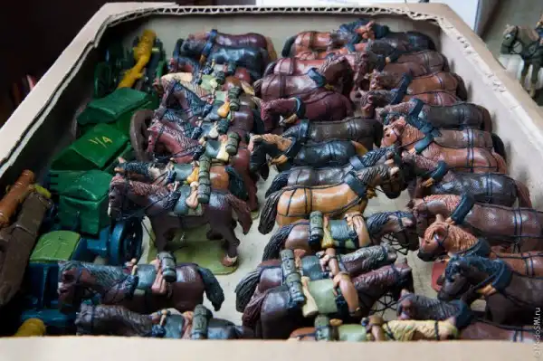 Хранятся фигурки в картонных коробках из–под бумаги А4. В коробке — пять картонных “полок” (отец клеил их сам), на каждой уложены солдаты и/или лошади. Коробки стоят на антресолях и в шкафу. По сути, всё хранится в тёмном прохладном месте и пока живо.