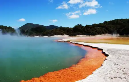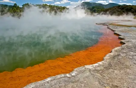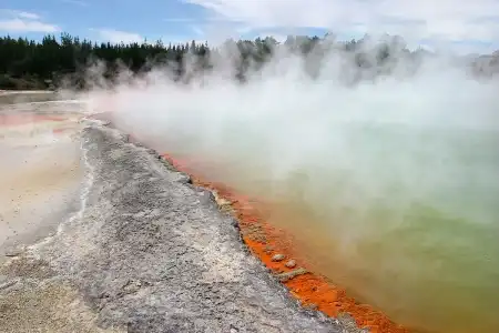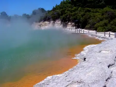 В геотермальном регионе Северного острова Новой Зеландии Уаи-О-Тапу есть целый бассейн с шампанским. На самом деле это горячий термальный источник. Он расположен в 30 км к юго-востоку от Роторуа и около 50 км на северо-запад от Таупо. Название Бассейн с шампанским (Champagne Pool) получено благодаря обильным выбросам углекислого газа (CO2), что делает воду в источнике похожей на шампанское.