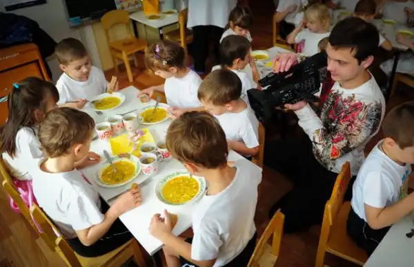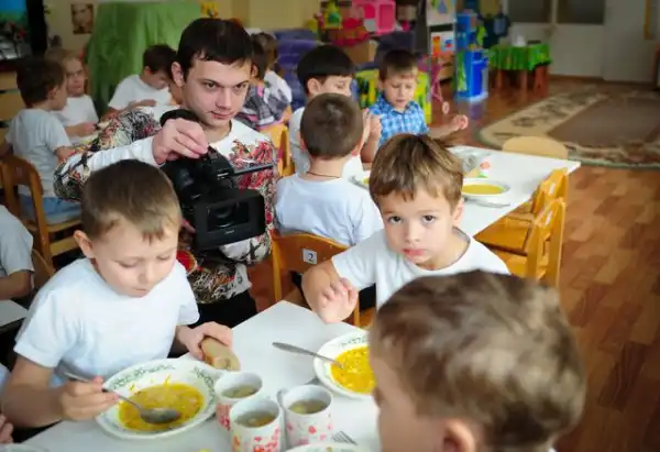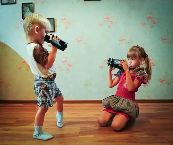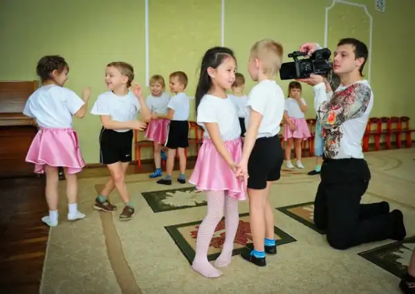 Дети рады позировать. Внешность «кинорежиссера» и камера располагают.