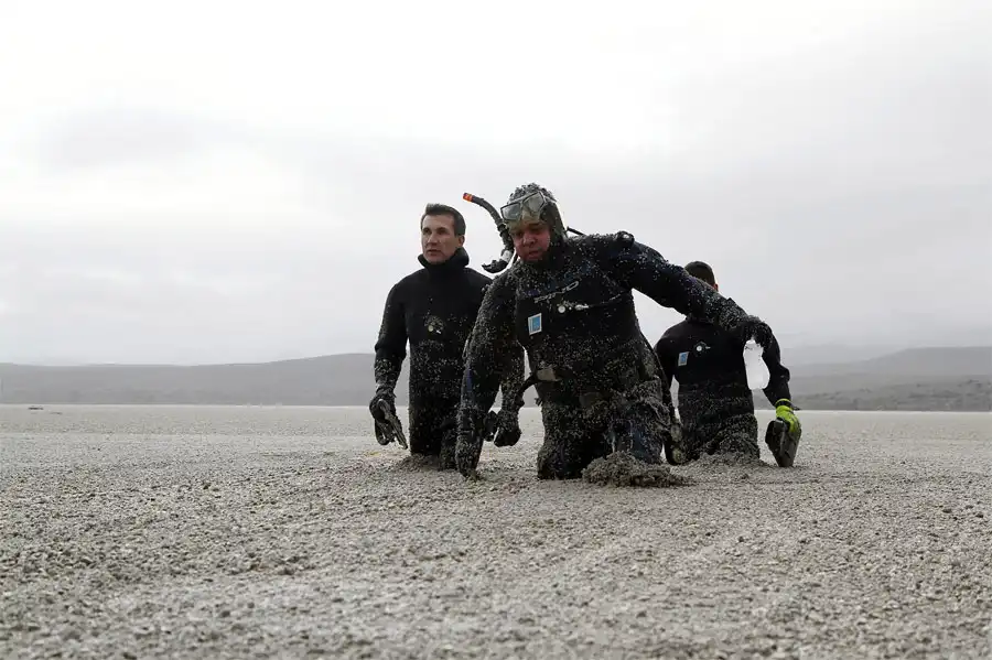 Водолазы на реке Лимай в Аргентине, покрытой пеплом извергающегося вулкана Пуйеуэ. © Chiwi Giambirtone/Reuters