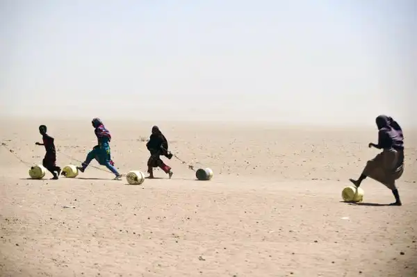 Кенийские жители катят бочки с водой неподалеку от города Ваджир. © Jakob Dall/Danish Red Cross/Reuters