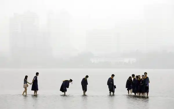 Китайские выпускники на затопленном мосту посреди озера в Ухане. © Darley Wong/Reuters