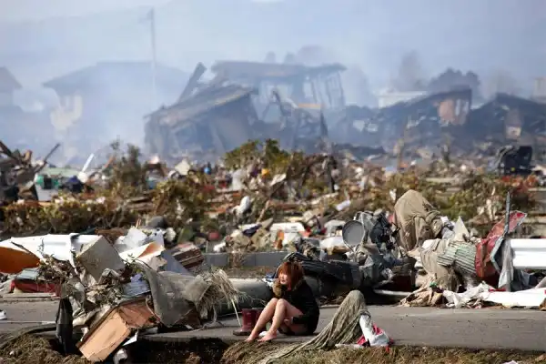 Женщина плачет на дороге посреди разрушенном землетрясением и цунами города Натори в Японии. © Asahi Shimbun/Reuters
