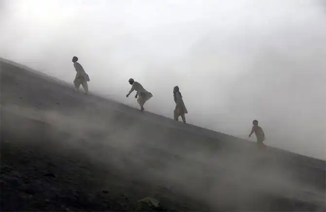 Пакистанские индуисты взбираются на грязевой вулкан в провинции Белуджистан во время религиозного ритуала.
