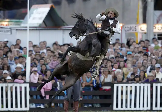 Гаучо укрощает коня на празднике Criolla в Монтевидео, Уругвай.