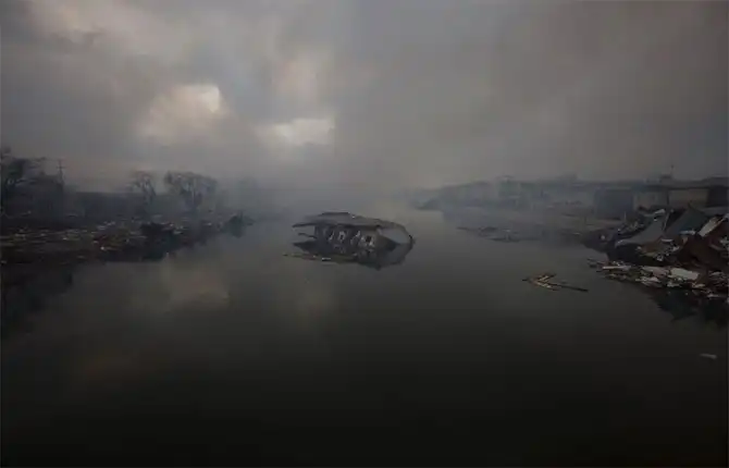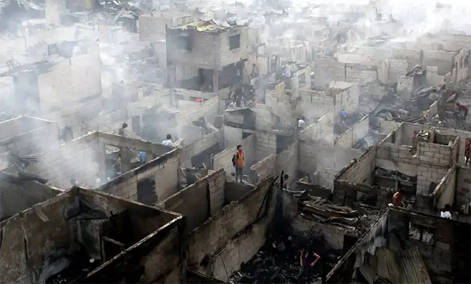 Филиппинец ищет ценные вещи в воде, заполненной мусором после крупного пожара в Маниле.