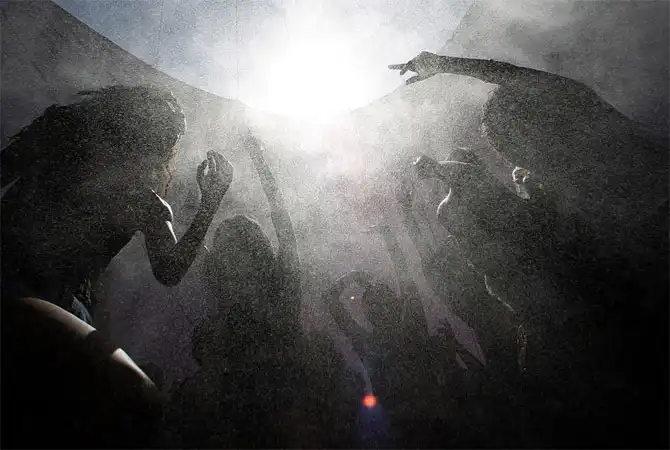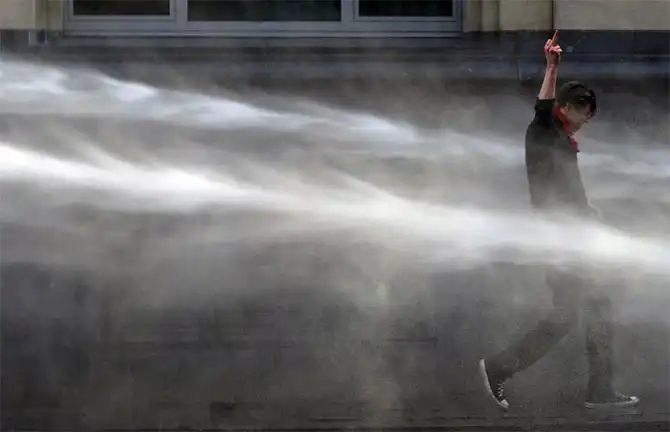 Посетители фестиваля Coachella в Калифорнии танцуют под брызгами холодной воды.