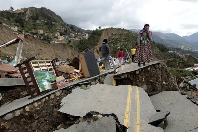 Местные жители на дороге в Ла-Пасе, разрушенной оползнем.